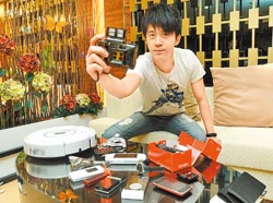 他包包内有iPhone、太阳能充电器、随身投影机、四连拍相机、心跳手表等,为何要用手表测量心跳?他说,去健身房时,可测出心肺功能练得够不够,约会时,也可测量对方心跳速度,是把妹利器。他最得意的战利品是3万元机器人吸尘器,家中流浪狗小High与它「和平共处」,还会起身让它彻底清扫,「狗把它当菲佣。」